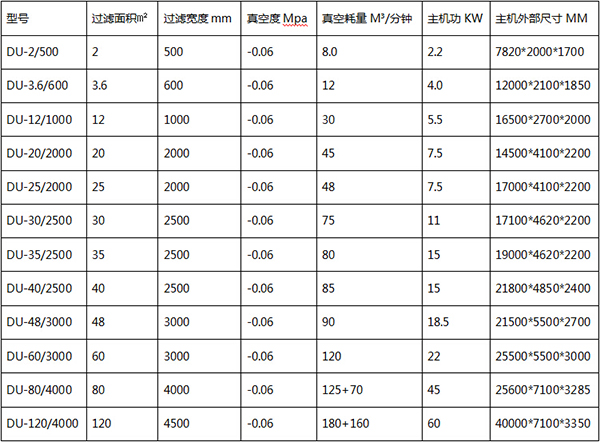DU橡膠帶式真空過濾機(jī)參數(shù)表:(部分規(guī)格):